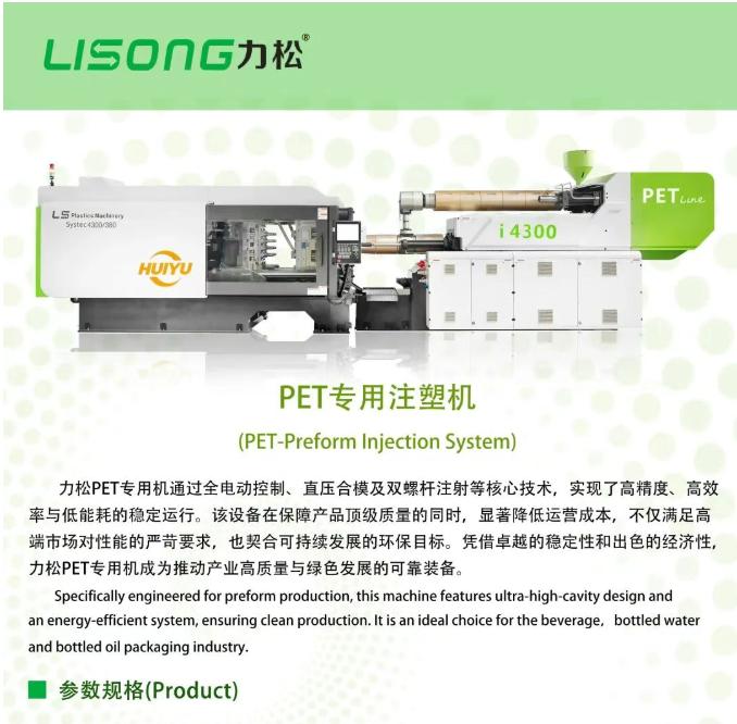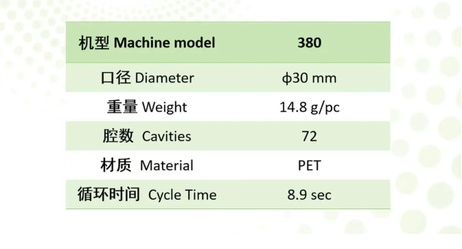 该机型制造30mm瓶胚直径,1出72腔的超高腔数模具,实现了惊人的8.9秒超短周期,单件产品克重精准控制在14.8克。这一组合充分展现了力松在高速、高产量领域的深厚技术底蕴,为瓶坯等包装制品生产商提供了极具竞争力的设备选择。