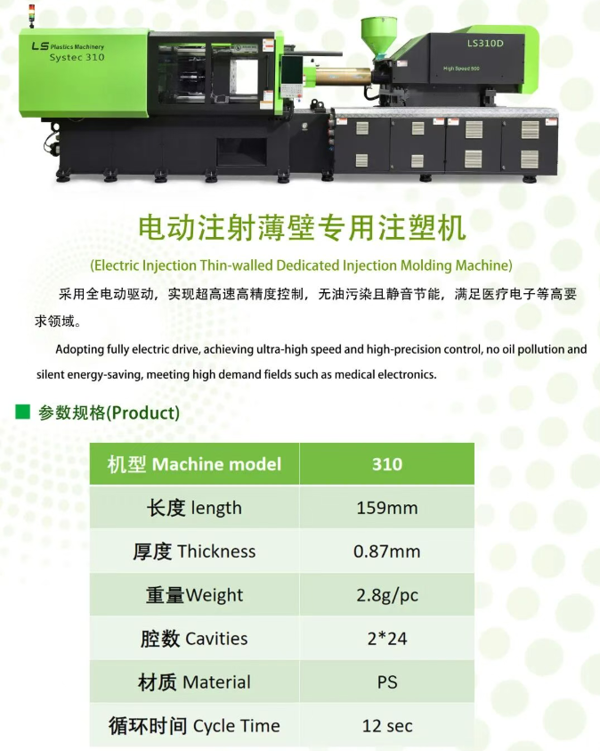 电注射薄壁机型专为快餐盒、饮品杯/盖等薄壁制品优化,该机型实现1出48腔,在12秒的周期内稳定生产,成品克重仅2.8克。其出色的流动平衡性和快速的冷却效率,确保了产品的高质量与低变形,满足了市场对轻量化、低成本生产的迫切需求。