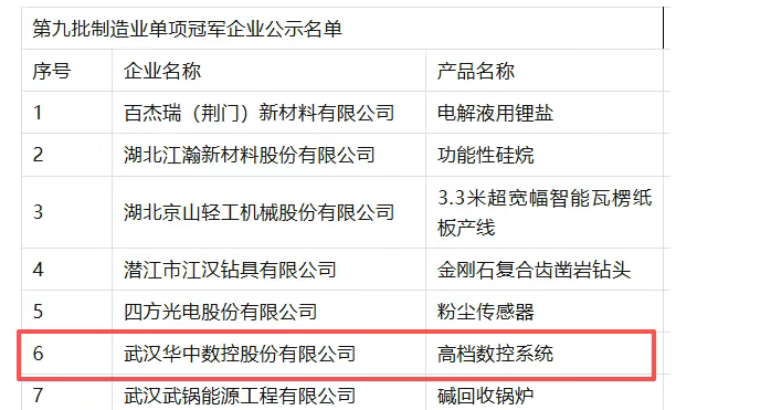 近日,工业和信息化部公示了第九批国家级制造业单项冠军企业名单,华中数控高档数控系统荣获“国家级制造业单项冠军产品”称号。