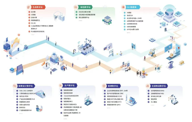 从管理数字化(ERP、CRM等系统)、生产数字化(智能机床、工业机器人等)到绿色数字化(ESG解决方案、碳足迹管理等),涵盖研发设计、生产制造、仓储物流等全环节,全方位展示数字化转型成果。
